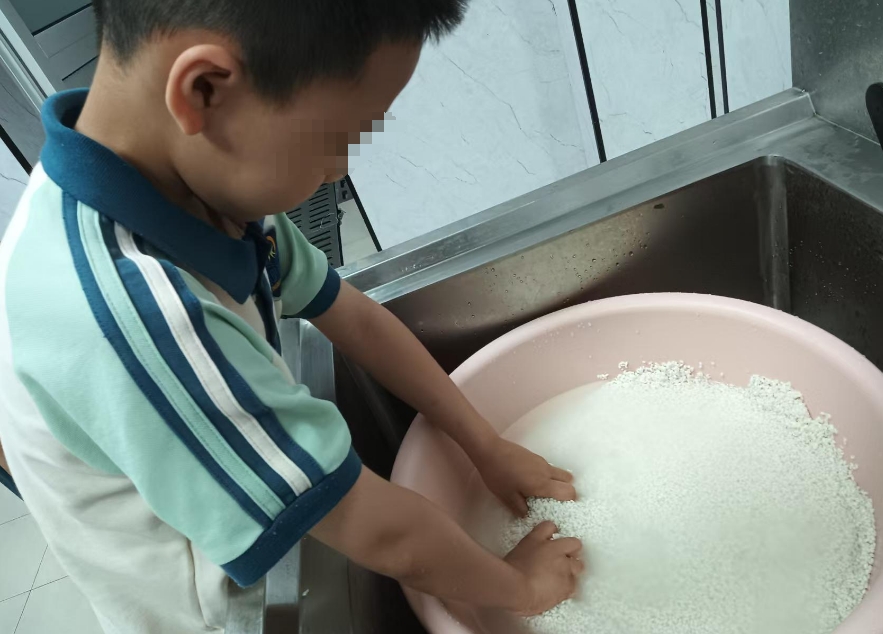 活动开始前,老师们早早准备好了碧绿的粽叶、雪白的糯米、香甜的红枣等食材。当孩子们看到这些五颜六色的材料时,好奇的目光瞬间被吸引,兴奋之情溢于言表。在老师的耐心指导下,孩子们纷纷加入到洗粽叶的行列中。他们小心翼翼地捧起粽叶,认真地在水盆里清洗,虽然动作略显笨拙,但专注的模样让人动容。一双双小手轻柔地抚摸着粽叶,水波纹在盆中荡漾,仿佛也在为孩子们的认真劲儿鼓掌。