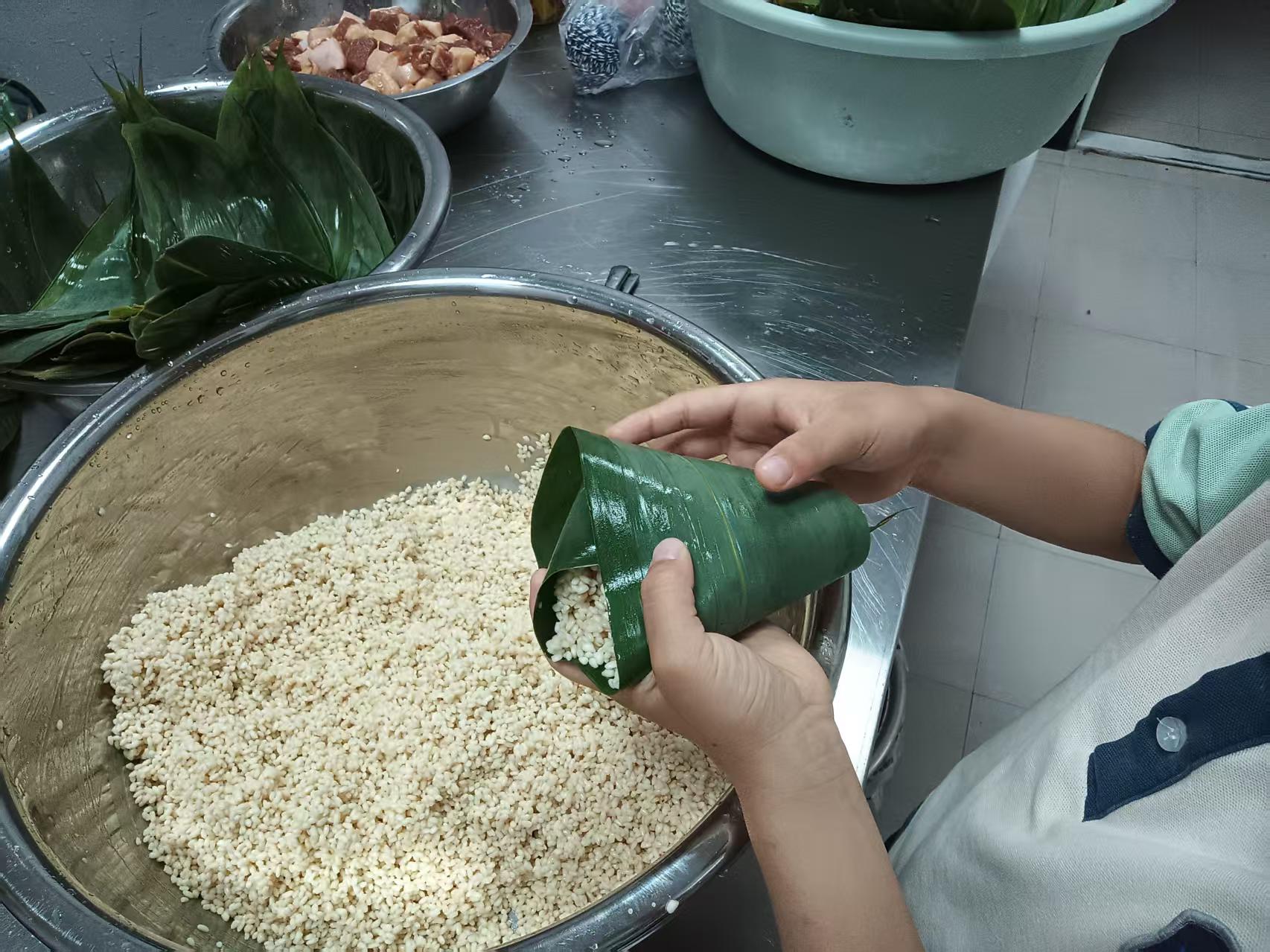 洗好粽叶,包粽子环节正式开始。老师们手把手地教孩子们如何折粽叶、填糯米、放馅料、包裹和捆扎。起初,孩子们包的粽子形状各异,有的漏米,有的捆不紧,但他们没有丝毫气馁,在老师和同伴的鼓励下,不断尝试。一个扎着羊角辫的小女孩,全神贯注地盯着老师的示范动作,努力模仿着,终于成功包出了一个歪歪扭扭却充满童趣的小粽子,她抬起头,脸上绽放出灿烂的笑容,向周围的人展示自己的“成果”。